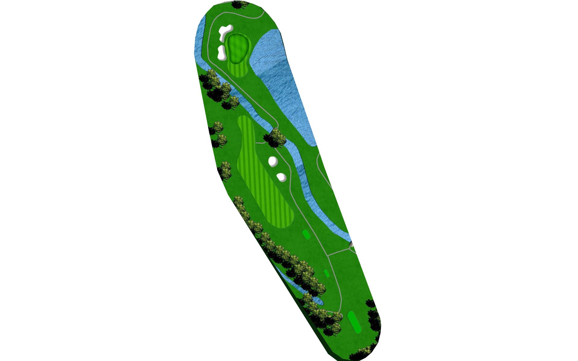 Keep it straight off the tee to avoid the big lake on right and trees down the left. Second shot plays a bit longer with the raised green. Miss left to avoid the water.